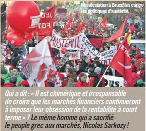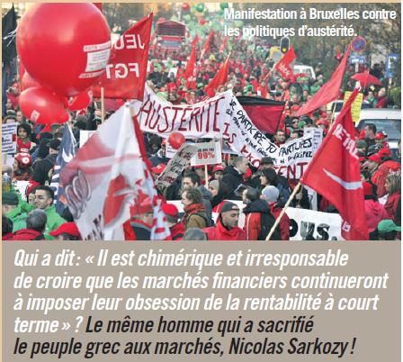 Ainsi, un an après ces accents généreux,le même homme lançait aux côtés de la Chancelière allemande,sous couvert de « sauvegarde de la stabilité de la zone euro »,la plus vaste et la plus cruelle entreprise de régression sociale,de soumission aux marchés financiers et de démontage d’acquis démocratiques de toute l’histoire de la construction européenne, à l’encontre du peuple grec, puis des peuples irlandais et portugais,avant de tenter d’imposer une logique similaire à l’ensemble des pays membres de l’UE.A cet égard,la descente aux enfers dans laquelle sont entrainés des millions de Grecs prend de jour en jour des proportions si dramatiques qu’elle appelle à elle seule ce vent de révolte naguère évoqué dans l’indigne discours-bluff de Sarkozy à l’OIT. Le vote Front de Gauche et l’action pour une victoire solide et durable de la gauche en France constitueront un authentique acte de révolte en même temps que de solidarité avec les victimes du sarkozisme au-delà de nos frontières.