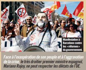 contribué à plonger l’Espagne dans une crise d’une brutalité inouïe.Les deux dernières années resteront dans la mémoire collective espagnole comme celles d’un véritable calvaire,que résument trois chiffres monstrueux:près d’un Espagnol sur quatre,dont quasiment un jeune de moins de 25 ans sur deux, sont au chômage;dans un million et demie de foyers espagnols,pas une seule personne n’a un emploi! Cette situation sinistrée n’a pas empêché la Commission européenne de fixer -et le nouveau Premier ministre de droite d’accepter- des objectifs drastiques de « réductions des déficits publics ».Conservateur discipliné,Mariano Rajoy s’engagea à réaliser un « ajustement » budgétaire de près de …40 milliards d’euros en 2012 et à mettre en oeuvre les « réformes » attendues par Bruxelles et les « investisseurs »:retraite à 67 ans; non-remplacement des fonctionnaires partant en retraite;gel ou réduction des salaires des agents publics;réforme « très ambitieuse » (dixit Sarkozy) du marché du travail;purge sévère dans les régions (notamment chargées des dépenses d’éducation et de santé)…