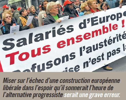 Voilà qui confirme nos analyses depuis le traité de Maastricht en 1992 et qui conforte notre volonté de mener le combat pour rompre avec les logiques et les structures malfaisantes qui sont au coeur de ce système.Nous ne saurions pourtant nous réjouir de cette situation!Car nous n’oublions pas que les peuples directement visés payeraient au prix fort le fait que leurs pays soient livrés aux spéculateurs et qu’ils se lanceraient dans une surenchère de concurrence économique,de dévaluations « compétitives » et de dumping salarial, dans l’espoir de remonter la pente et de « regagner la confiance des marchés »,fût-ce en enfonçant le voisin.Nous sommes également conscients du fait qu’aucun peuple ne profiterait de cette déliquessence de l’euro.Les pays qui échapperaient à l’effet-domino des expulsions seraient poussés à s’intégrer dans une sorte de club des pays « vertueux » (au sens que donnent à ce mot les marchés financiers) sous la houlette de la classe dirigeante allemande.Enfin,il tombe sous le sens que ce contexte de crise aggravée serait un terreau fertile pour les nationalismes,les populismes,la xénophobie: un climat à l’évidence peu propice à la pensée critique,à l’intervention citoyenne ou à l’action solidaire!Miser sur cet échec retentissant d’une construction libérale dans l’espoir qu’il sonnerait l’heure de l’alternative progressiste serait donc,à mes yeux, une grave erreur.