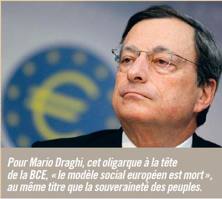 Mais l’offensive des ultra qui ont inspiré ce traité ne s’arrêterait pas là.Une fois franchie cette étape sonnerait l’heure de la suivante.Leur feuille de route n’est pas un secret.Mario Draghi,le président de la Banque centrale européenne,avait annoncé la couleur dès février dernier: »Le traité budgétaire,c’est le début » avait-il déclaré au Wall Street Journal.Ironisant sur l’époque où certains considéraient que « les Européens pouvaient se permettre de payer tout le monde pour ne pas travailler »,il avait martelé: »Ce temps-là est révolu ». « Le modèle social européen est mort » avait-il souligné.C’est au nom de cette « vision » de l’Europe que le même Draghi juge « inévitable » une « union financière,budgétaire et politique (qui) conduira à la création de nouvelles entités supranationales »(Le Monde 22/7/2012).Ce processus de centralisation des leviers du pouvoir à l’abri des citoyens est naturellement promu au nom de la lutte contre la crise.Comme le dit non sans cynisme le président du Conseil européen,M.Van Rompuy: »La crise de la dette souveraine constitue une formidable opportunité pour un véritable bond en avant de l’intégration économique ».Un document traçant les grandes lignes de ce « bond » étalé sur une dizaine d’années sera même discuté avant la fin 2012…