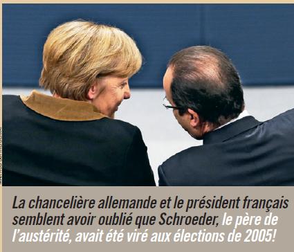Gageons que le « peuple de gauche », des deux côtés du Rhin, a une autre vision de l’amitié franco-allemande que celle du père des « lois Hartz », qui avaient d’ailleurs valu à son parti d’être chassé du pouvoir. On peut imaginer que nombre de sympathisants socialistes français accueillent avec circonspection sinon inquiétude le satisfecit accordé par Schroeder au gouvernement Hollande-Ayrault au sujet du « processus de réformes qui semble enfin engagé » de ce côté-ci du Rhin.