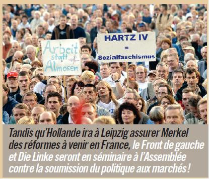 Le jeudi 23 mai prochain aura lieu à l’Assemblée Nationale – mais ouvert à tous – un séminaire franco-allemand qui tranchera à tous égards avec les rencontres bilatérales traditionnelles qui se multiplient tant au niveau présidentiel ou gouvernemental qu’entre les partis, notamment socialistes, des deux rives du Rhin. Il s’agit d’une heureuse initiative conjointe du Front de Gauche et de Die Linke sur trois thèmes d’une brûlante actualité: « L’agenda néolibéral : soumission du politique aux marchés financiers. Quelles alternatives ? » ; « De l’expérience allemande des lois Hartz au piège de l’ANI en France: un défi politique pour la gauche » et « Compétitivité, concurrence, esquives et alternatives ». (1) S’y côtoieront des parlementaires des deux pays (dont le président du groupe de la « Gauche démocratique et républicaine », André Chassaigne, et le vice-président de Die Linke, député au Bundestag, Dr Axel Troost; des économistes « Front de gauche » ainsi que plusieurs « Économistes attérés »; des syndicalistes; une sociologue; le directeur du département « mondialisation et stratégies de développement » de la Conférence des Nations Unies pour le Commerce et le Développement (CNUCED)…Un temps y sera réservé au débat avec le public, avant les conclusions, très attendues dans le contexte politique actuel, de Pierre Laurent, secrétaire national du PCF et président du Parti de la Gauche Européenne.